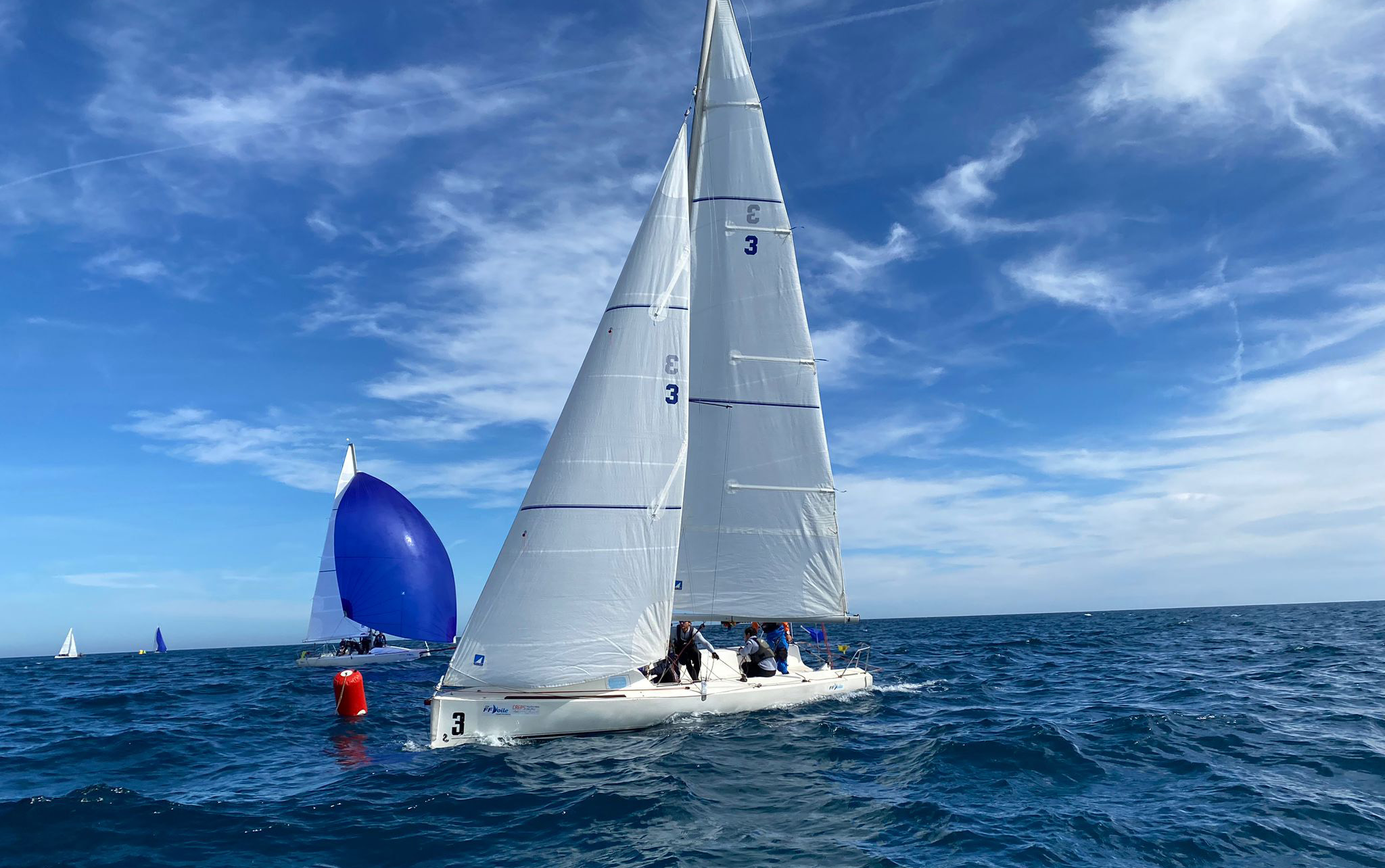 C'est donc avec 8 noeuds de vent d'Est que Damian Michelier (2) affrontait Ian Gerreta (7), que Ange Delerce (3) s'opposait à Pauline Courtois (5) et qu'enfin Thimotée Rossi (4) retrouvait Noé Ackermann (6). Finalement, c'est ce dernier duel, entre deux équipages qui c'étaient déjà affrontés en novembre, au même endroit, au même niveau de la compétition, mais dans le cadre du Championnat de France Espoirs qui a été le plus disputé. A la différence du mois de novembre, c'est Thimotée Rossi et ses équipiers qui s'imposent 3-2. Pendant ce temps, Pauline Courtois (Championne du Monde Féminine 2021 et 2022) s'imposait 3-0, même résultat pour Ian Garreta.