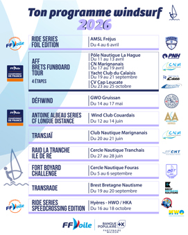 La saison s’ouvrira début avril avec les Ride Series Foil Edition à Fréjus, premier rendez-vous de l’année orienté « perf’ et glisse ». En mai, place au mythe avec le Défi Wind à Gruissan, plus grand événement funboard au monde, véritable temps fort du calendrier international où engagement, endurance et esprit de partage se conjuguent dans le temps d’un long week-end convivial.
